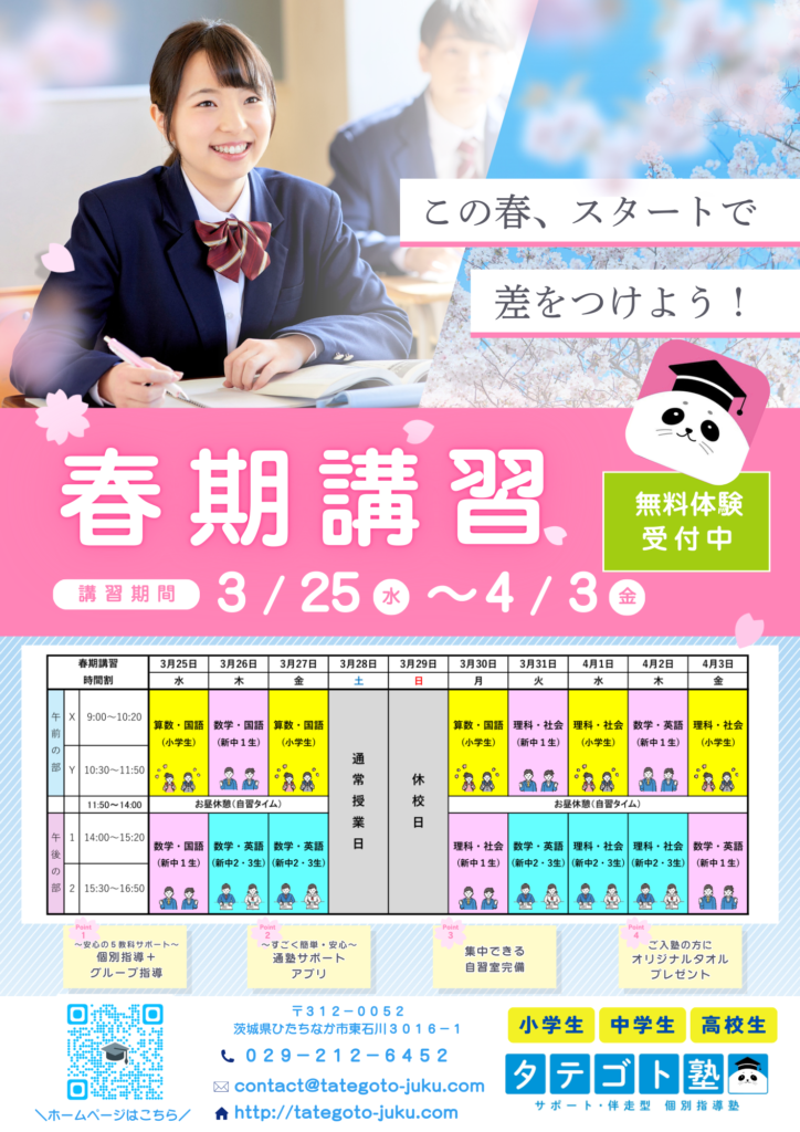 ~ サポート・伴走型 個別指導塾 タテゴト塾 ~ アザラシがイメージキャラクターのひたちなか市の学習塾 タテゴト塾 小学生 中学生 高校生(数学・英語・ICT) お問い合わせ 受験本番に向けて~ 冬期講習スタート♪ 5月 ゴールデンウイーク 休校日のお知らせ 5月(GW)は下記、休校日とさせていただきます。授業のある生徒さまは授業のお振替をお願いいたします。・休校日:5月3日(土)~6日(火) [ TATEGOTO-JUKU ] ひたちなか市の兄弟がつくったサポート・伴走型 個別指導塾 楽しいから、成績もあがる 生徒のベストを引き出し、夢に向かって頑張る! 勉強についてこんなお悩みはありませんか? お子さま ✓勉強の仕方が分からない✓成績が上がらないから楽しくない✓部活や他のことに熱中したいから今はやる気になれない 保護者さま ✓普段から勉強している様子がない✓成績が上がらなくて心配だ✓仕事が忙しく、勉強を見てあげられない そんな子たちも、講師と共に勉強して、 自主的に勉強できるようになり... 高校一般入試の受験生一人平均 120点UP! 多くの生徒さまが80点UP! 3ヶ月で153点UPした生徒も! ※5科目の合計点数(講師実績) タテゴトクジュク たてごとじゅく tategotojuku tategoto-juku ひたちなか市 水戸市 学習塾 個別指導塾 講師 塾講師 アルバイト 個別学習塾 家庭教師 茨城県 那珂市 水戸 mito 中学生向け 小学生向け 高校生向け 大学受験 高校受験 生徒募集 自習室 登校拒否 地域密着 地元 割引 安い 格安 激安 atama plus atama+ アタマプラス 頭プラス あたまぷらす 受験 志望校合格 合格 予備校 城南 森塾 教室 学習空間 hitati 日立 啓明 高等学校 高校 茨城キリスト教 いばきり イバキリ 常磐 ときわ トキワ 水戸女子 水城 葵陵 短期 赤本 ICT AI 講師募集 正社員 明光義塾 成績 アップ 塾 やる気スイッチ 一会塾 ONE スクールIE スクール スクパス 緑岡 水戸第一 水戸第二 水戸第三 茨城大学 茨大 起業 自主性 桜ノ牧 実績 だから勉強に自信が出る!! タテゴト塾の3つの特徴 TATEGOTO-JUKU 徹底的サポート・伴走型個別指導 生徒一人ひとりの軸を探り、それぞれに合ったペースで細やかにサポートする徹底的伴走型個別指導。「勉強の仕方がわからない」という子に対して親身に考え、その子にあった勉強の入り口を提案いたします。進学・志望校合格への伴走はもちろん、学校の授業になかなかついていくのが難しい、もっと自信をつけたいと感じる生徒・保護者様にも、それぞれに本気で寄り添い、一緒に解決していきます。勉強の楽しさ、乗り越えることの素晴らしさを感じ、学ぶことで目標達成の楽しさを感じていただけます。 生徒・先生で共に目標に向かう タテゴト塾では、勉強しなさい、と押し付けることはありません。先生と生徒が一緒になって小さな目標設定を繰り返し、目標に対する道筋を見つけていきます。 追加授業も受けやすい料金設定 タテゴト塾では1コマあたりの追加料金をシンプルで安価に設定しております。必要に応じて増やしやすい料金設定で、もっと知りたいという気持ち、目標達成に全力で寄り添います。 それぞれの目的や希望に合わせた授業を行います! 対象 基本の教科に対応 【小学生】【中学生】【高校生】平日は22時までだから部活帰りでも通いやすい! 週の授業数 自由に組み合わせられる 推奨:【週1回】【週2回】【週3回】1コマ 80分 ・ 60分 ◎目的や希望に合わせて必要なカリキュラム・授業数をご提案させていただきます。 +個別指導の追加授業 必要に合わせて 受検・定期テスト・夏期講習・冬期講習など目的へのスケジュールを立て、授業の進捗状況に応じ気軽に追加授業をお申込みいただけます。スマホ・PCにて簡単にお申込み可能です。 選べる授業の形 個別指導 一人一人勉強の仕方を学ぶ 小学生・中学生国語、数学(算数)、英語、理科、社会 復習・予習パラレル授業高校受験・中学受験対策ほか ◎小学生 60分 週1回コース月額11,200円(税込)~ ◎中学生 80分 週1回コース月額14,500円(税込)~ 個別指導について グループ指導 個別指導と組合せで総合的アプローチ 小学生・中学生国語、数学(算数)、英語、理科、社会 英単語・漢字・計算・語彙ほか小学生はタブレット基礎学習をゲーム感覚で 小学生『基礎学力育成道場』3,000円(税込)~(パック特別価格) 中学生『理・社・国パック』3,000円(税込)~(パック特別価格) グループ指導について 受験生向けサポート伴走コース 万全のサポートで目標に向かう 個人個人の学習傾向をみて、ゴールを定めて戦略を立てる 英語リスニング、英語長文、国語総合、過去問演習 ほか 料金について詳しく 当塾は、自分に合った勉強法で楽しく成長を実感できる学習塾です TATEGOTO-JUKU タテゴト塾は、ひたちなか市・水戸市エリアの小中学生・高校生を中心に、サポート・伴走型個別指導を行っている学習塾です。勉強を強要することはなく、その子に合わせた勉強方法を提案することで「勉強が楽しくなる」「目標達成の道筋が分かる」指導を行っております。一緒になって勉強に向き